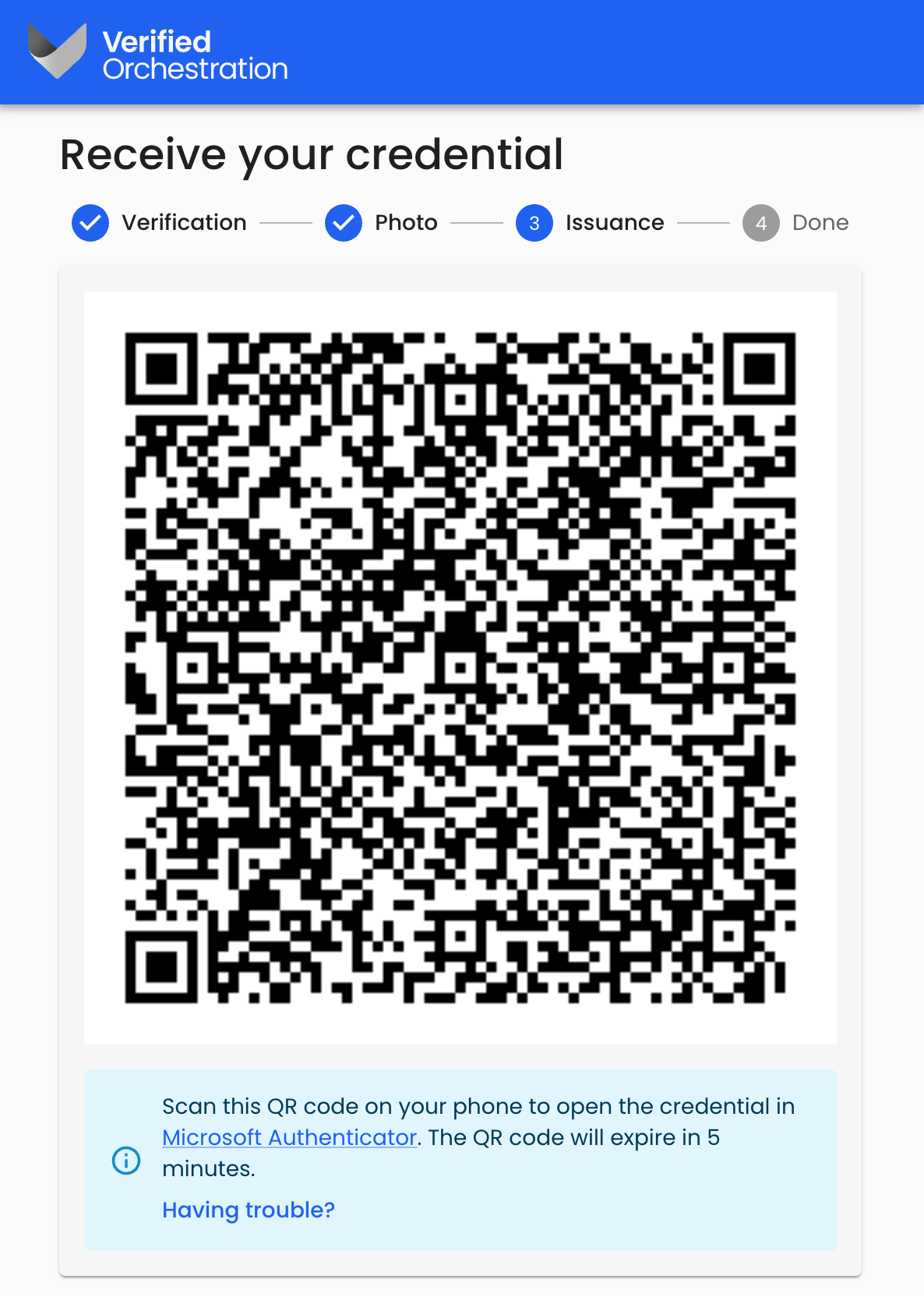 - During the Issuance step, scan the QR code using the Verified IDs area of the Microsoft Authenticator app and complete the credential issuance.